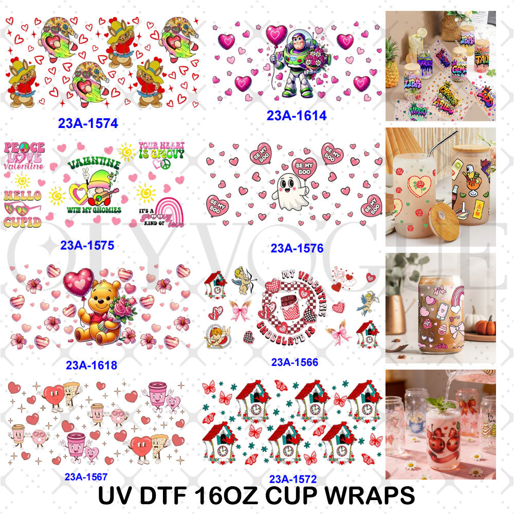 Wholesale 1pcs/5pcs Valentine's Day Heart-shaped House Cartoon Bear 16oz Cup UV DTF Wraps OLY Exclusive