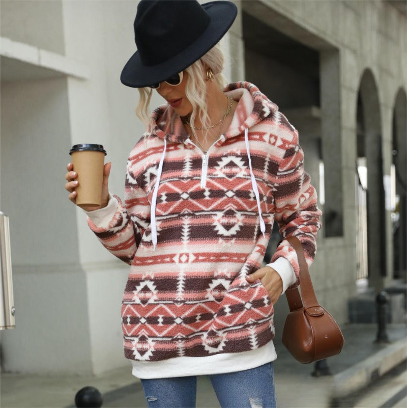 Wholesale Autumn and Winter Women's Aztec Hooded Half-Zip Pullover Sweatshirt