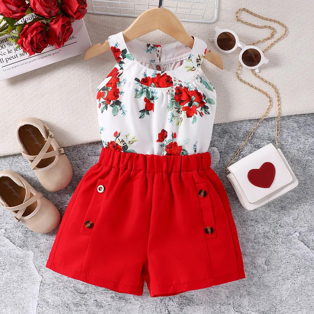 Wholesale Round Neck Rose Print Top + Solid Color Shorts Two-piece Baby Clothes