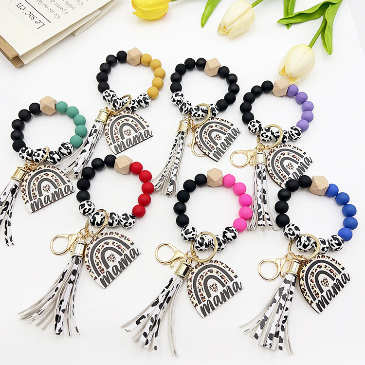 Wholesale Lacquer Round Beads Cow Pattern Wooden Beads Rainbow Wooden Sign Tassel Bracelet Keychain
