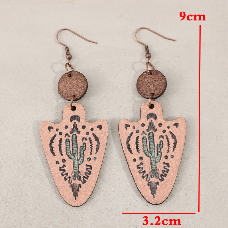Wholesale Western Vintage Style Arrow Carved Cactus Wooden Earrings