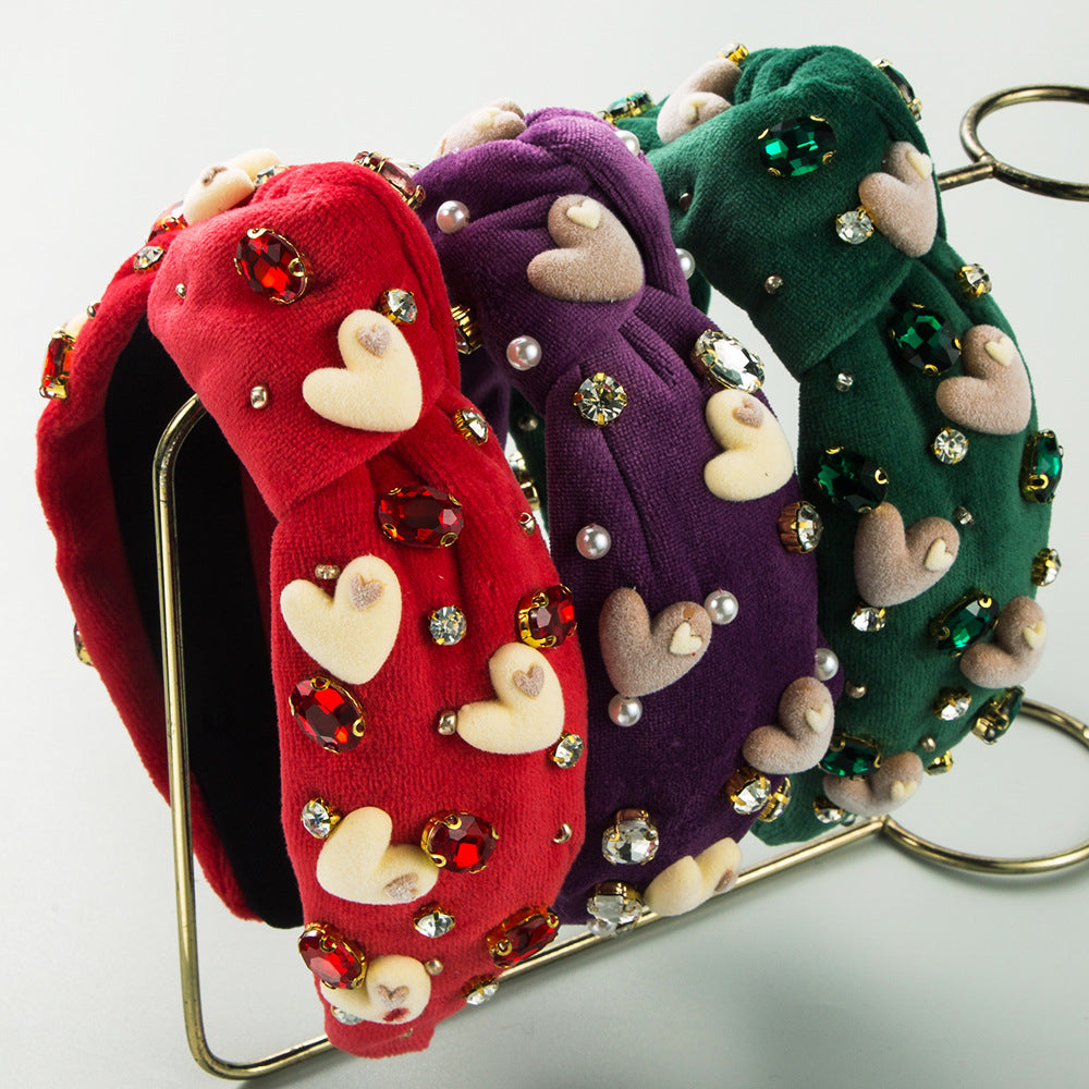 Wholesale Valentine's Day Hand-sewn Glass Diamond Love Velvet Headband