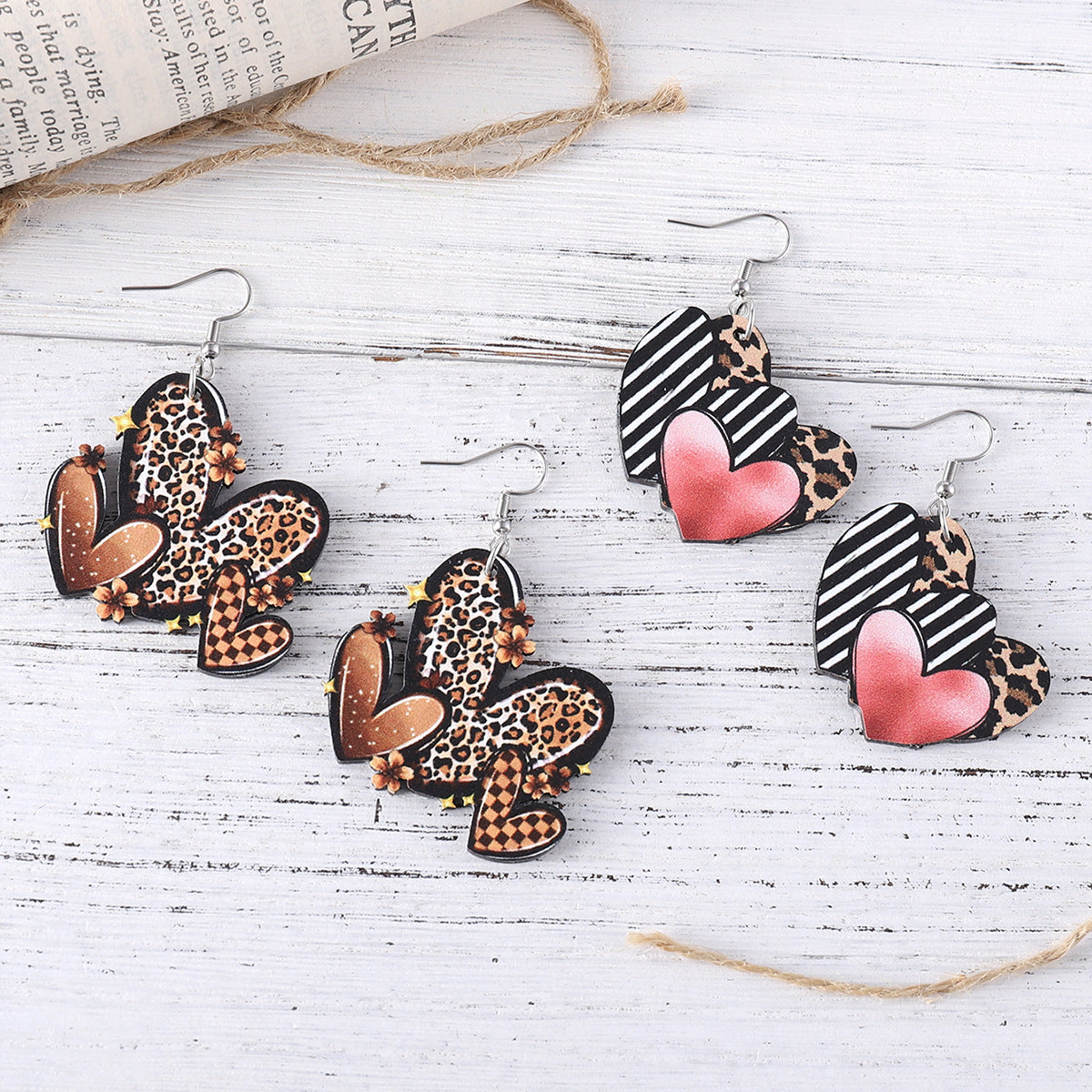 Wholesale Western style leopard print flower heart wooden double-sided earrings