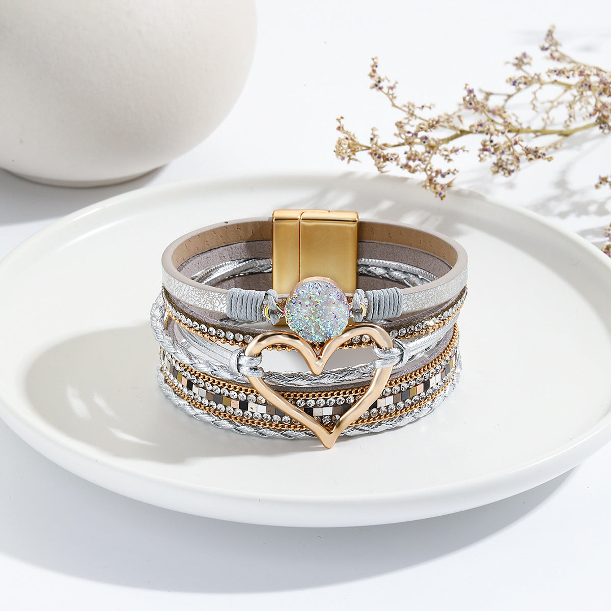 Wholesale Leather Cord Multi-Layered Raw Stone Love Bracelet