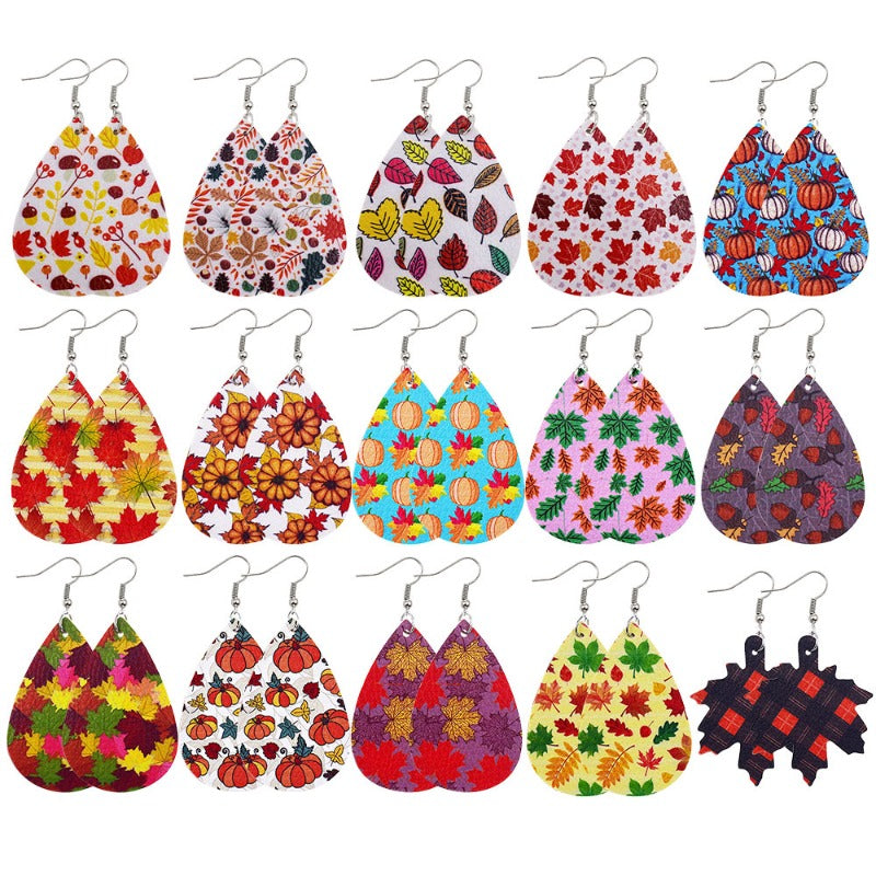 Wholesale Thanksgiving Pumpkin Autumn Maple Leaf Reversible Print Leather Earrings
