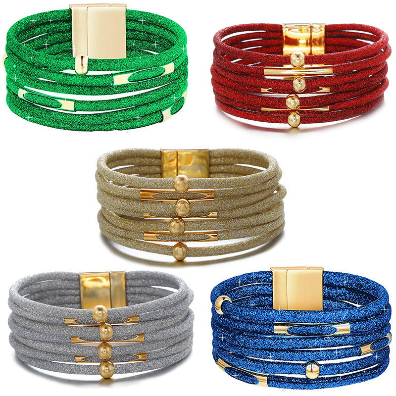 Wholesale Alloy Glitter Magnet Buckle Leather Beaded Leather Rope Copper Tube Bracelet