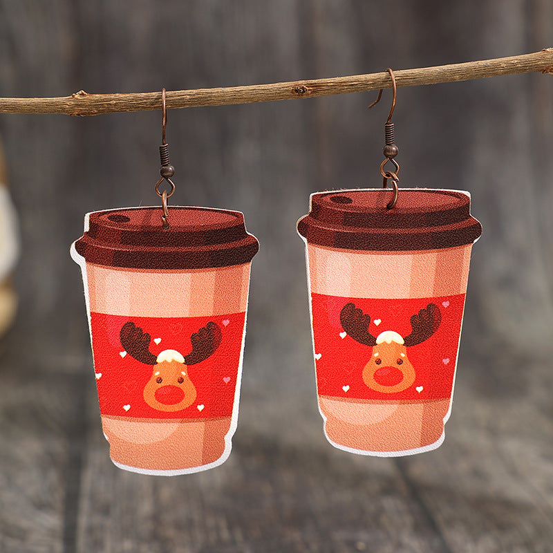 Wholesale Christmas Elk Snowman Coffee Cup Leather Earrings
