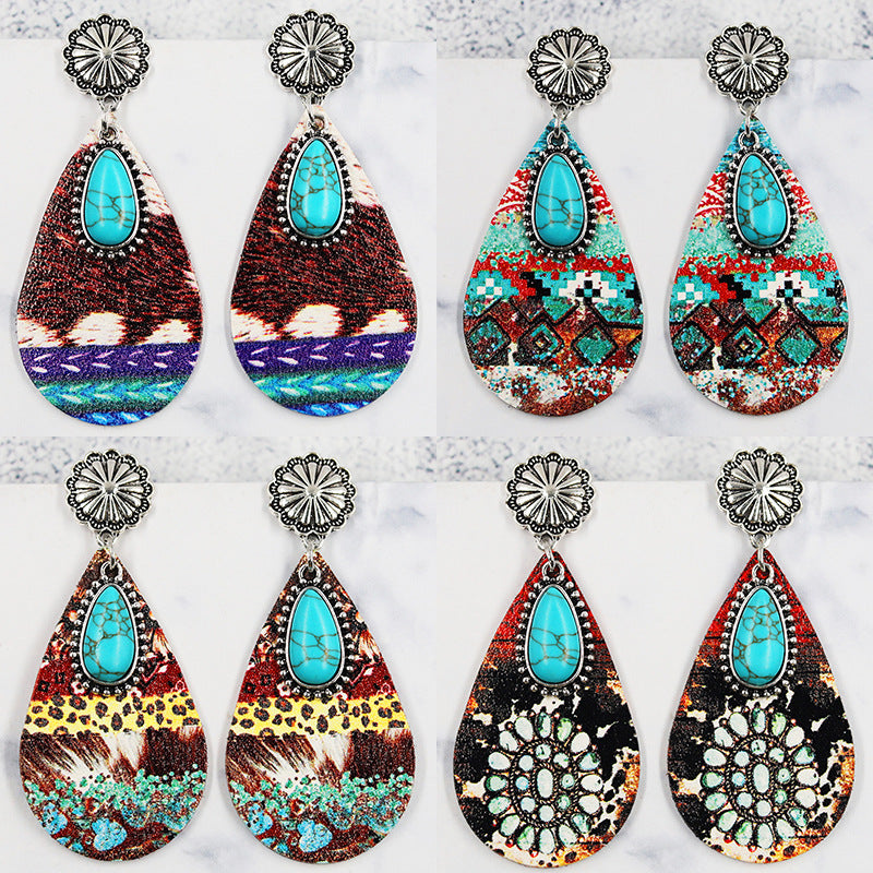 Wholesale Teardrop Leather Turquoise Vintage Ethnic Fashion Western Bohemian Earrings