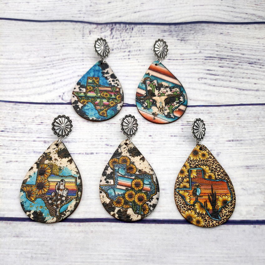 Wholesale Western Style Cow Pattern Sunflower Texas Map Leather Drop Earrings