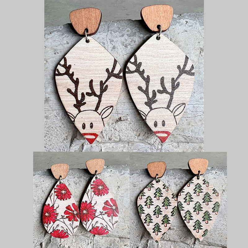 Wholesale 2 Pair/Pack Bohemian Vintage Wood Texture Christmas Deer Cute Plant Earrings