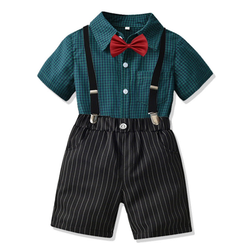 Wholesale Boys and Gentlemen's Cotton Bow and Plaid Short Sleeved Shirt and Suspender Suit
