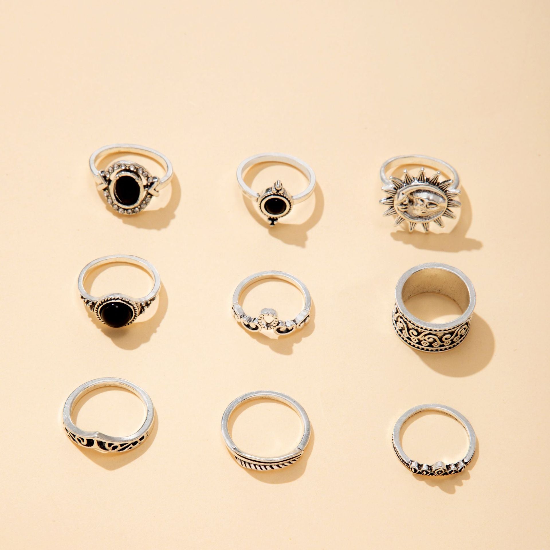 Wholesale Vintage carved sun feather cross black gemstone ring set