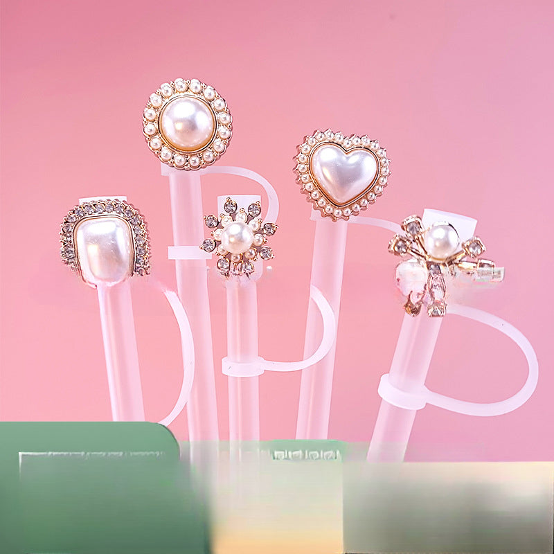 Wholesale 10pcs Acrylic Pearl Dust Cap Soft Rubber Straw Cover Cartoon Silicone Dust Cap Cup Accessories