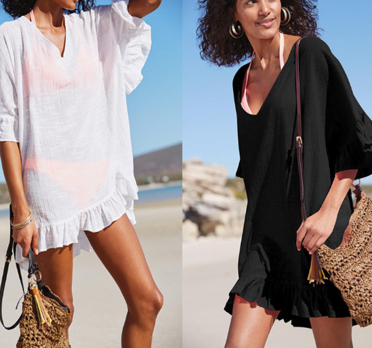 Wholesale Vacation Wind Beach Solid Color Ruffle V Neck Swimwear Cover Up