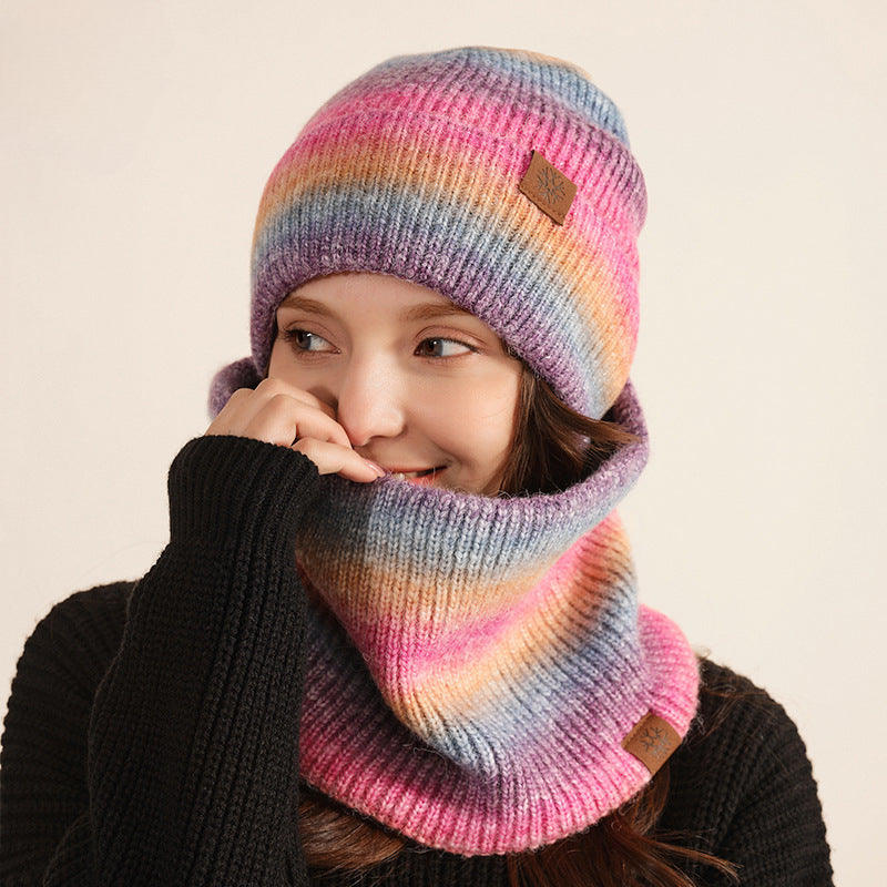 Wholesale Winter Outdoor Warm Tie-dye Knitted Scarf Hat Gradient Color Velvet Suit