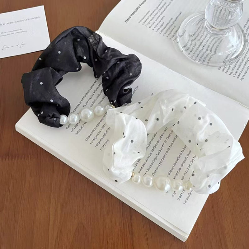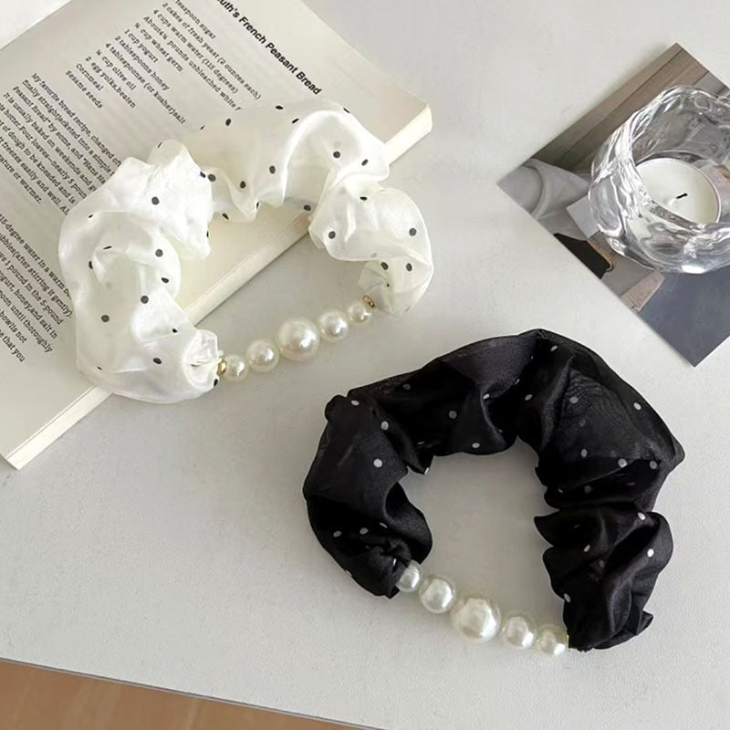 Wholesale Satin Tulle Polka Dot Pleated Pearl Hair Scrunchie