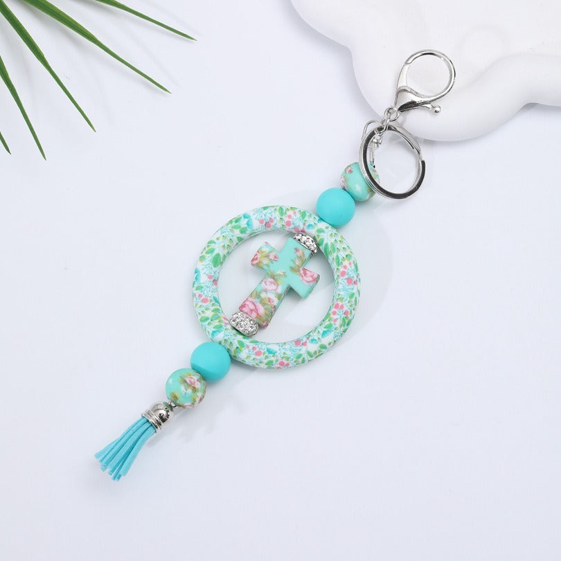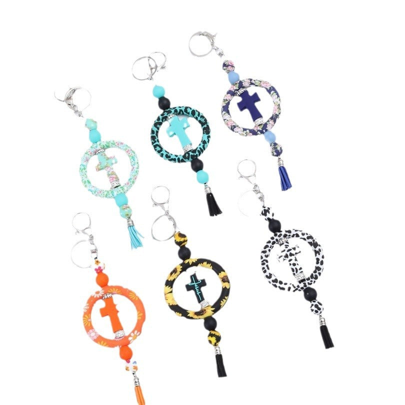 Wholesale Silicone Circle Beaded Ring Cross Printed Keychain