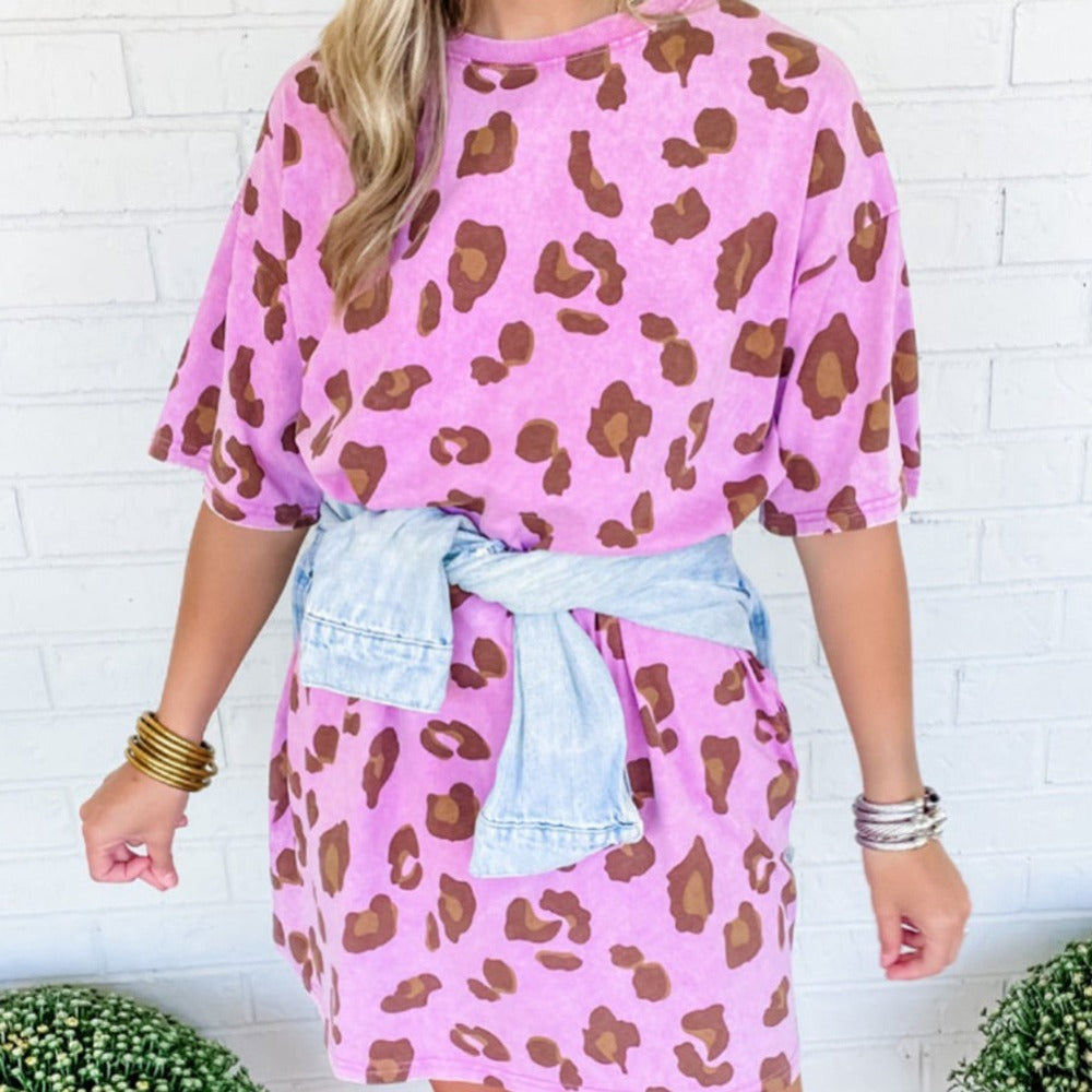Wholesale One Step Skirt Leopard Print Round Neck Loose Dress