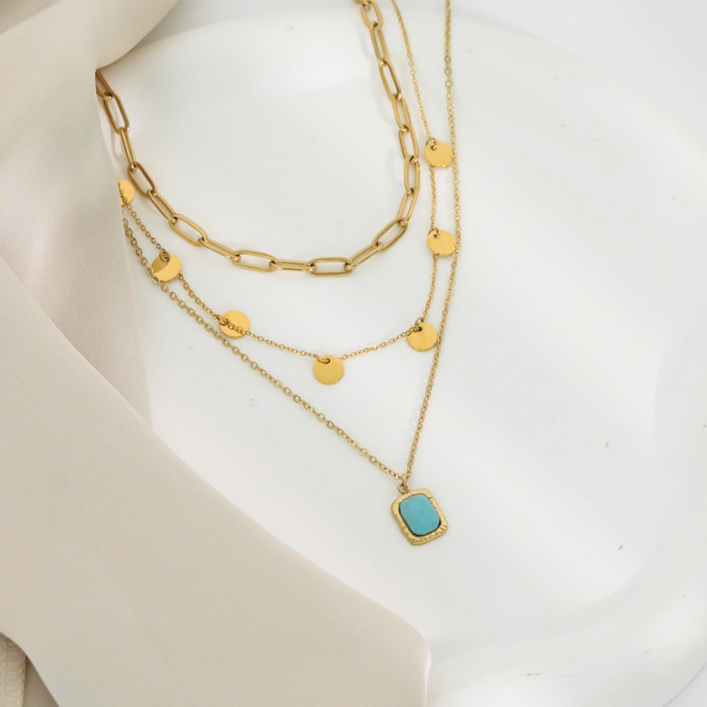Wholesale 20PCS Natural Stone Square Brand Titanium Steel Retro Multi-layer Turquoise Necklace