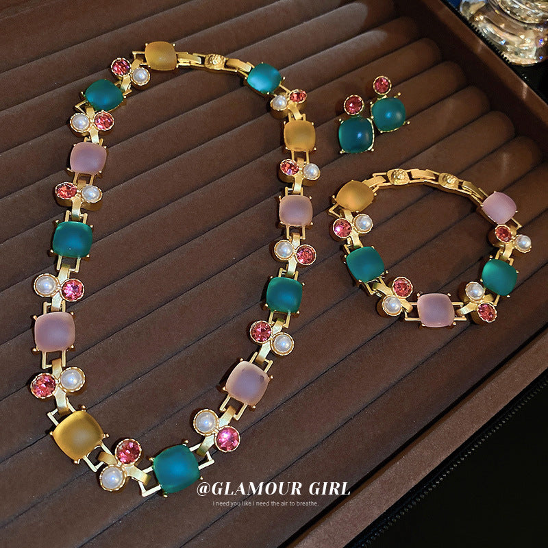 Wholesale Diamond and Pearl Square Buckle Bracelet Necklace and Earrings Set