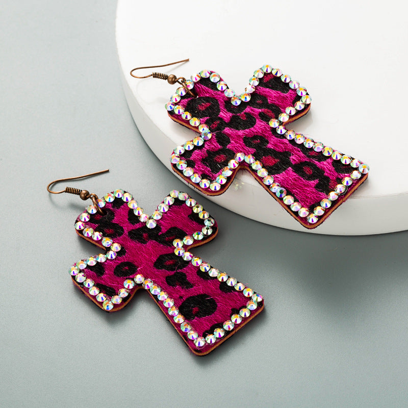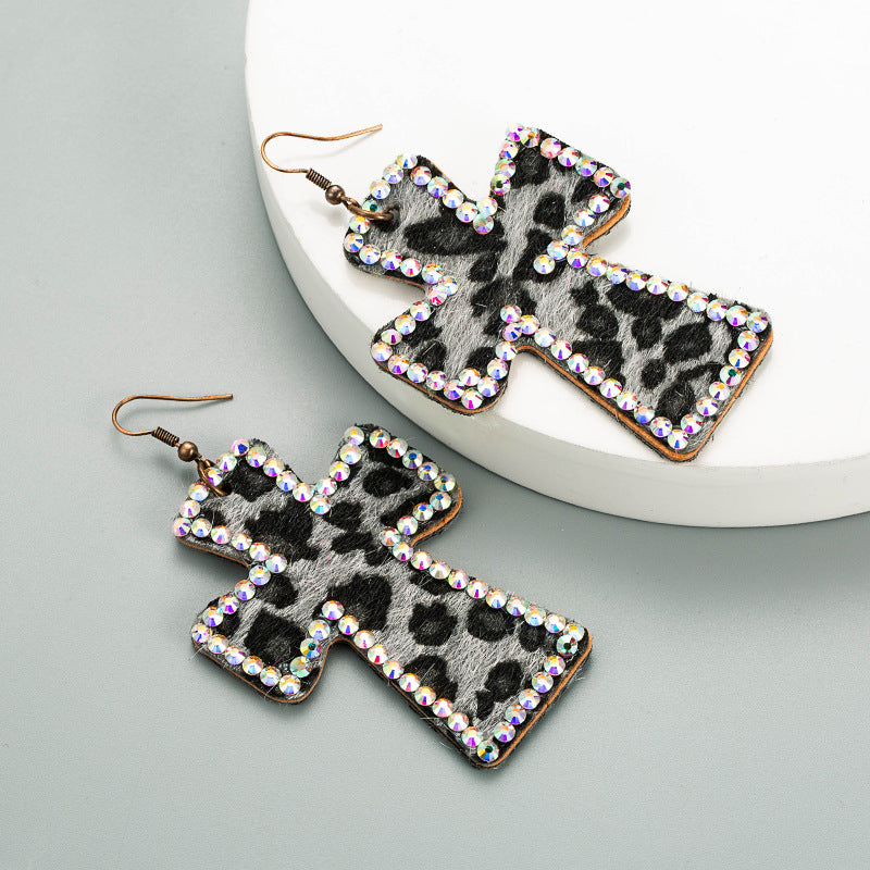 Wholesale Hot Girl Leopard Print Cross Exaggerated Adjustable Earrings