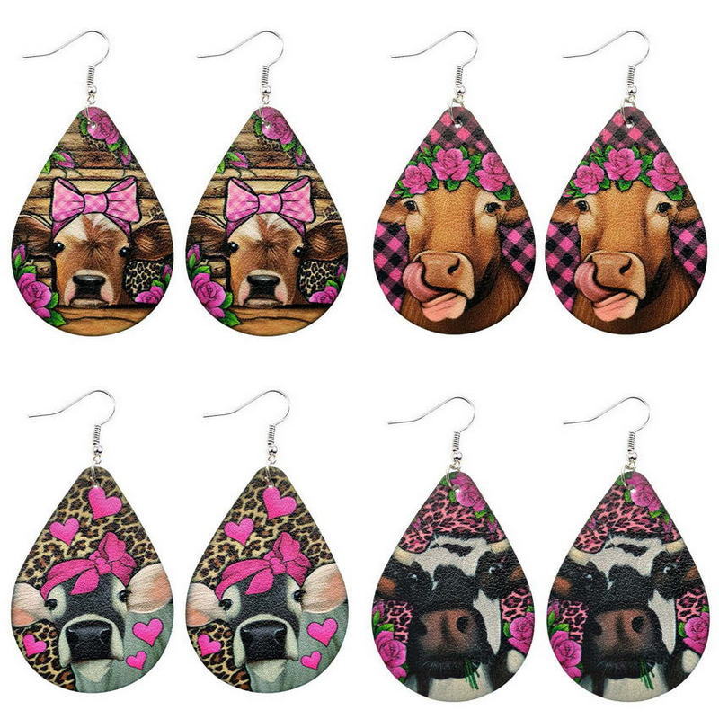 Wholesale Western Style Leopard Print Cow Head Flower Heart Valentine's Day Leather Drop Earrings