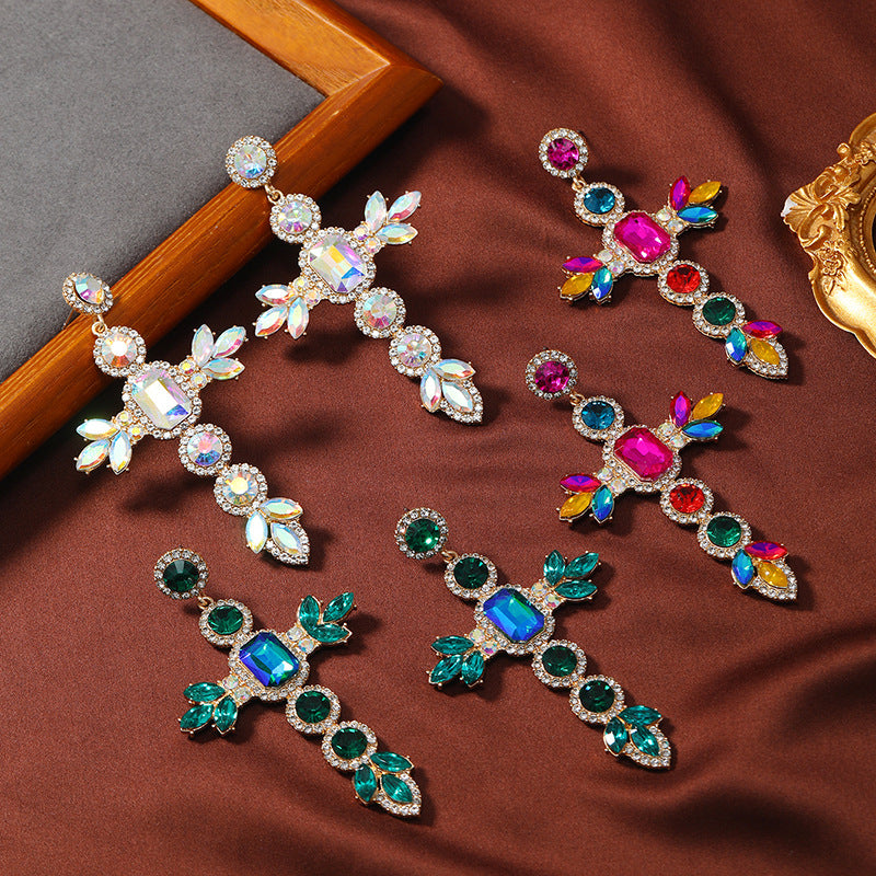 Wholesale Exaggerated Bohemian Colored Diamond Cross Earrings