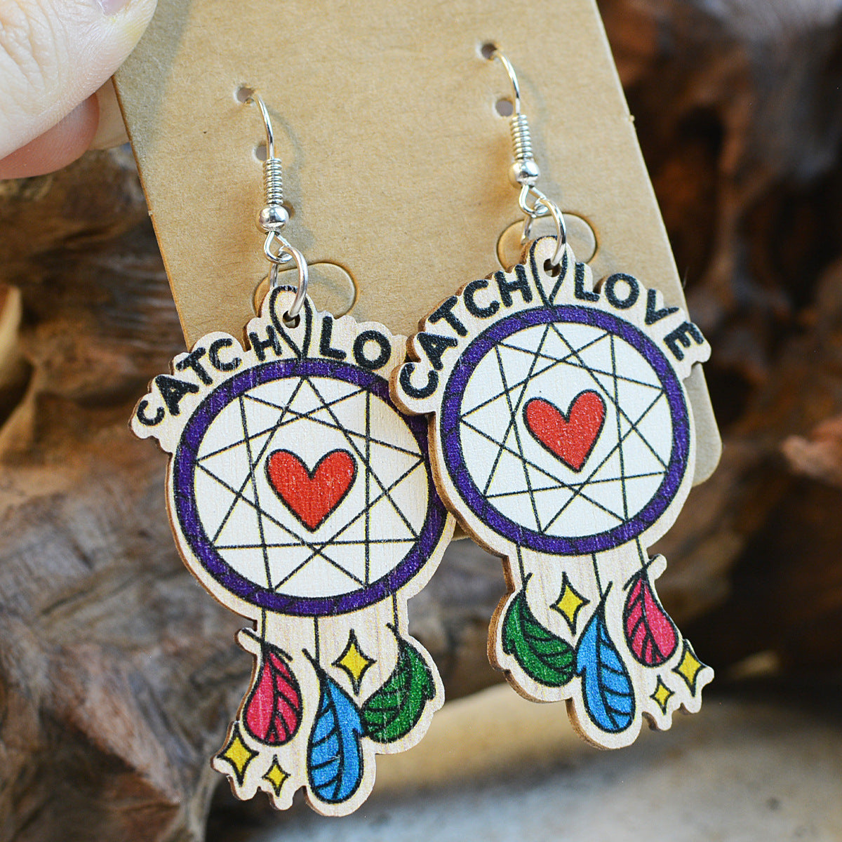 Wholesale Valentine's Day Wooden Dream Catcher Feather Earrings