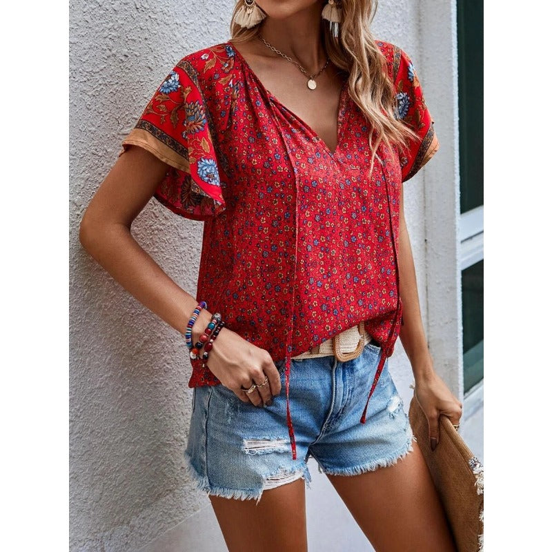 Wholesale Casual Print V -neck Loose Short Sleeves