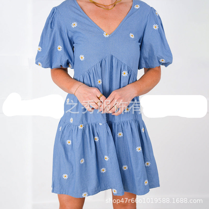 Wholesale Puff Sleeve Daisy Embroidered Dress