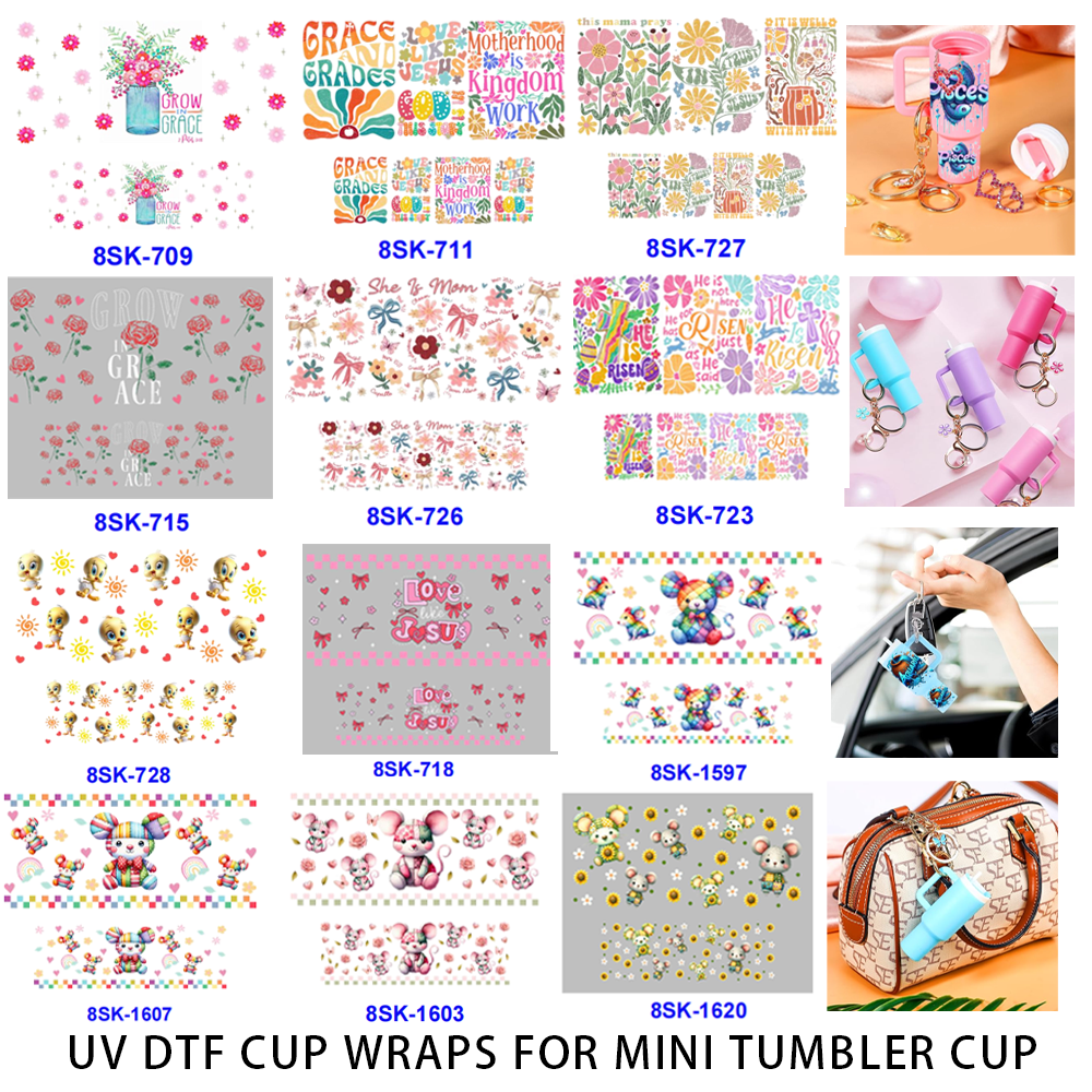 Wholesale 2/4/8 Pcs Colorful Flower Graffiti UV DTF Wraps Mini Tumbler Cup Keychain Lipstick Holders