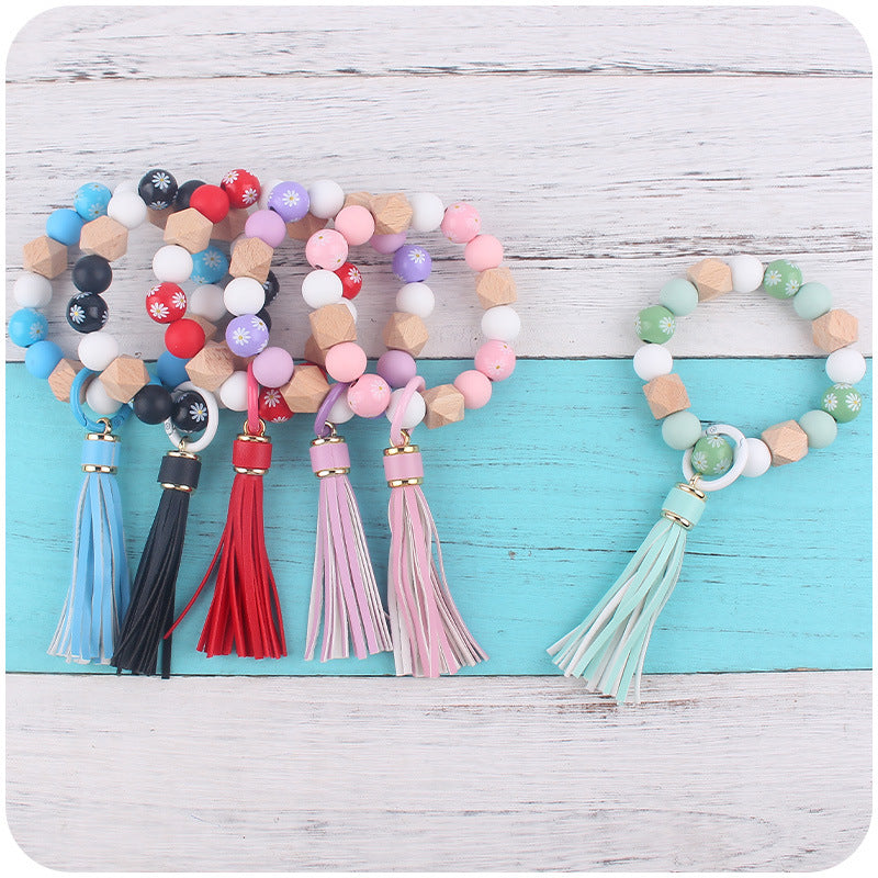 Madera de madera de madera de madera de madera pequeña PU PU Casas cortas de pulsera hechas a mano con llaves de cuentas