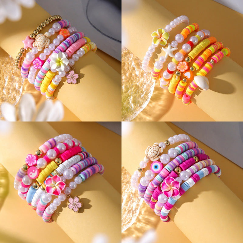 Wholesale College Style Colored Soft Clay Ocean Elements Five-petal Flower Shell Pendant Pearl Bracelet 6-piece Set