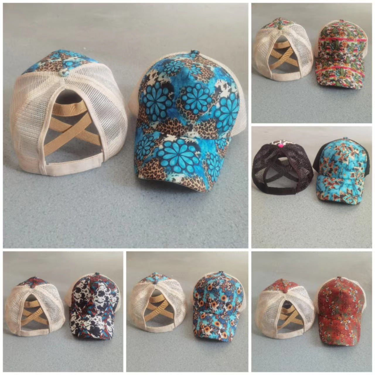 Wholesale Printed frayed edge cross ponytail baseball cap
