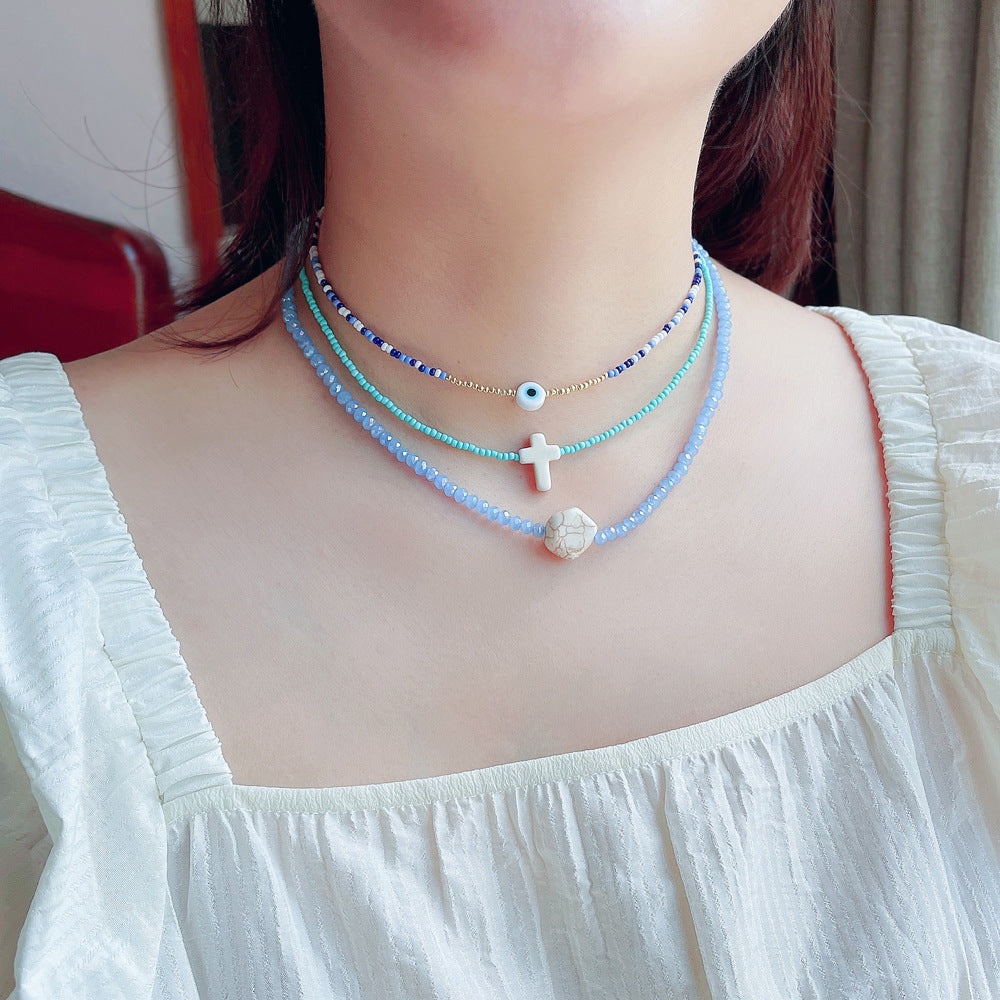 Collar de capa cruzada de perlas de arroz de ojos azules de vidrio al por mayor
