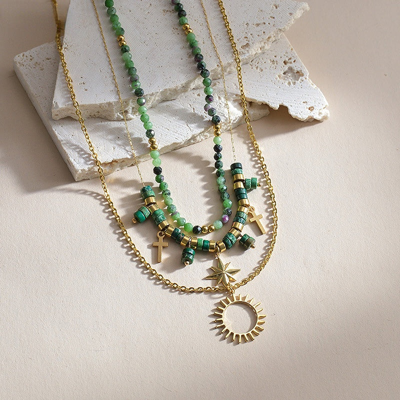 Venta al por mayor de titanio acero verde cuentas ocho Mangxing Cruz sol colgante collar