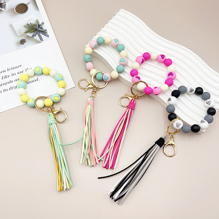 Wholesale Colorful Heart Silicone Beaded Velvet Tassel Wrist Keychain