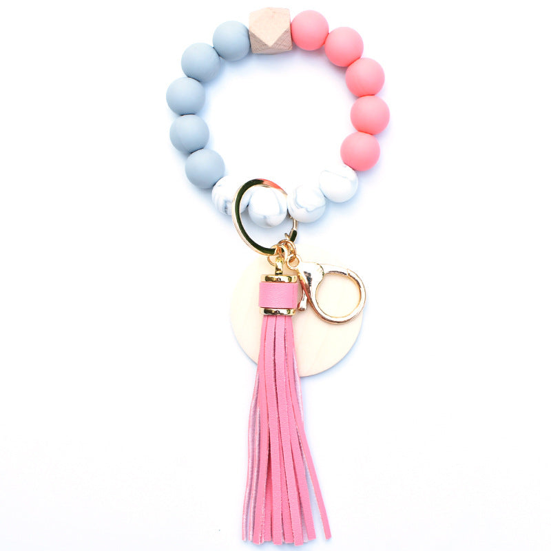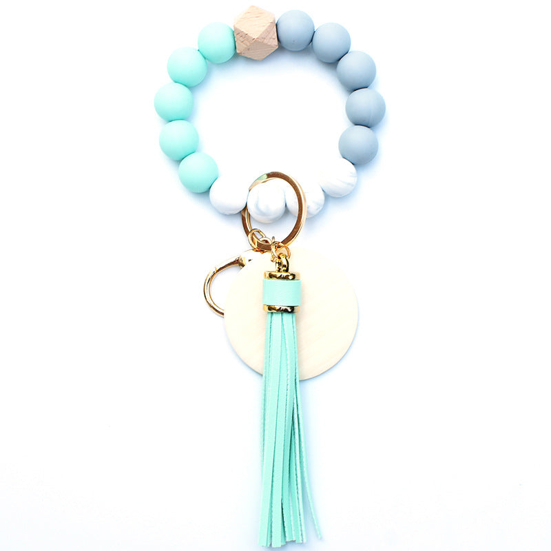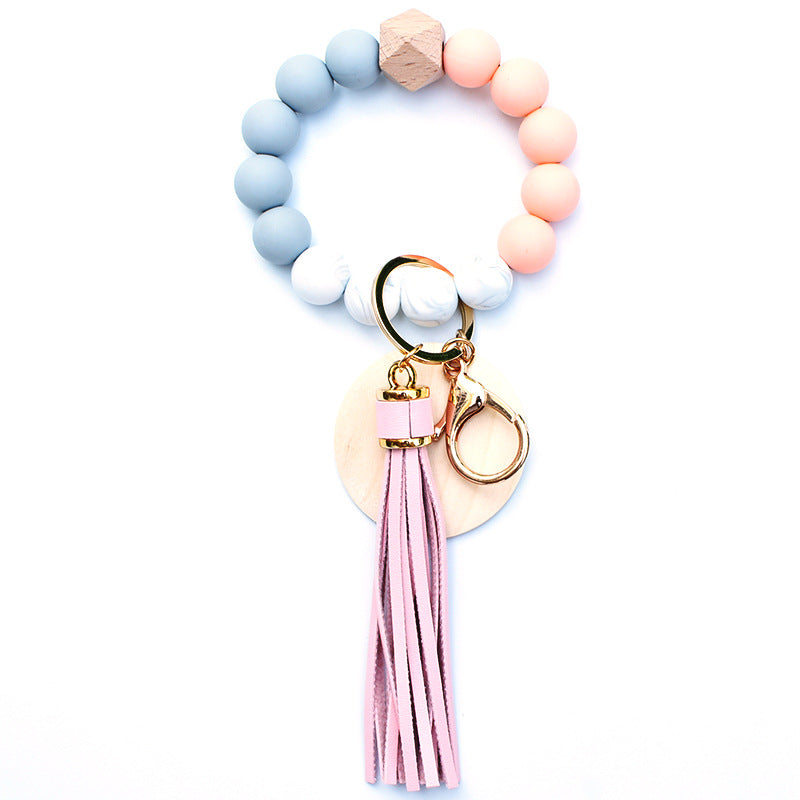 Llavero de muñeca de cuentas de madera con borla de silicona al por mayor