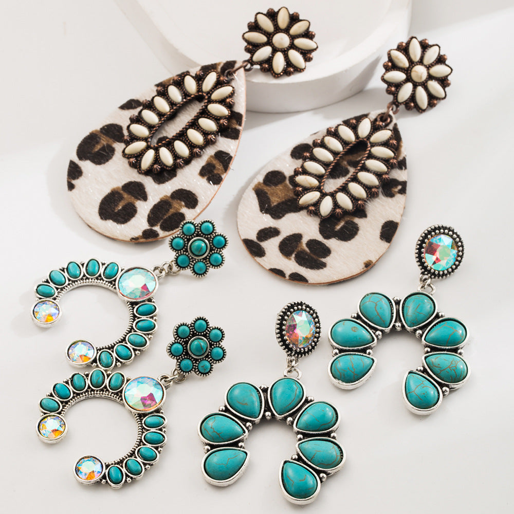 Wholesale Fashion Retro Turquoise Earrings High Sense Bohemian Leopard Leather Exaggerated Earrings