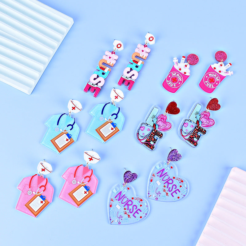 Wholesale Nurses' Day Pink Blue Nurse Uniform Nurse Cap Stethoscope Nurse Syringe Earrings