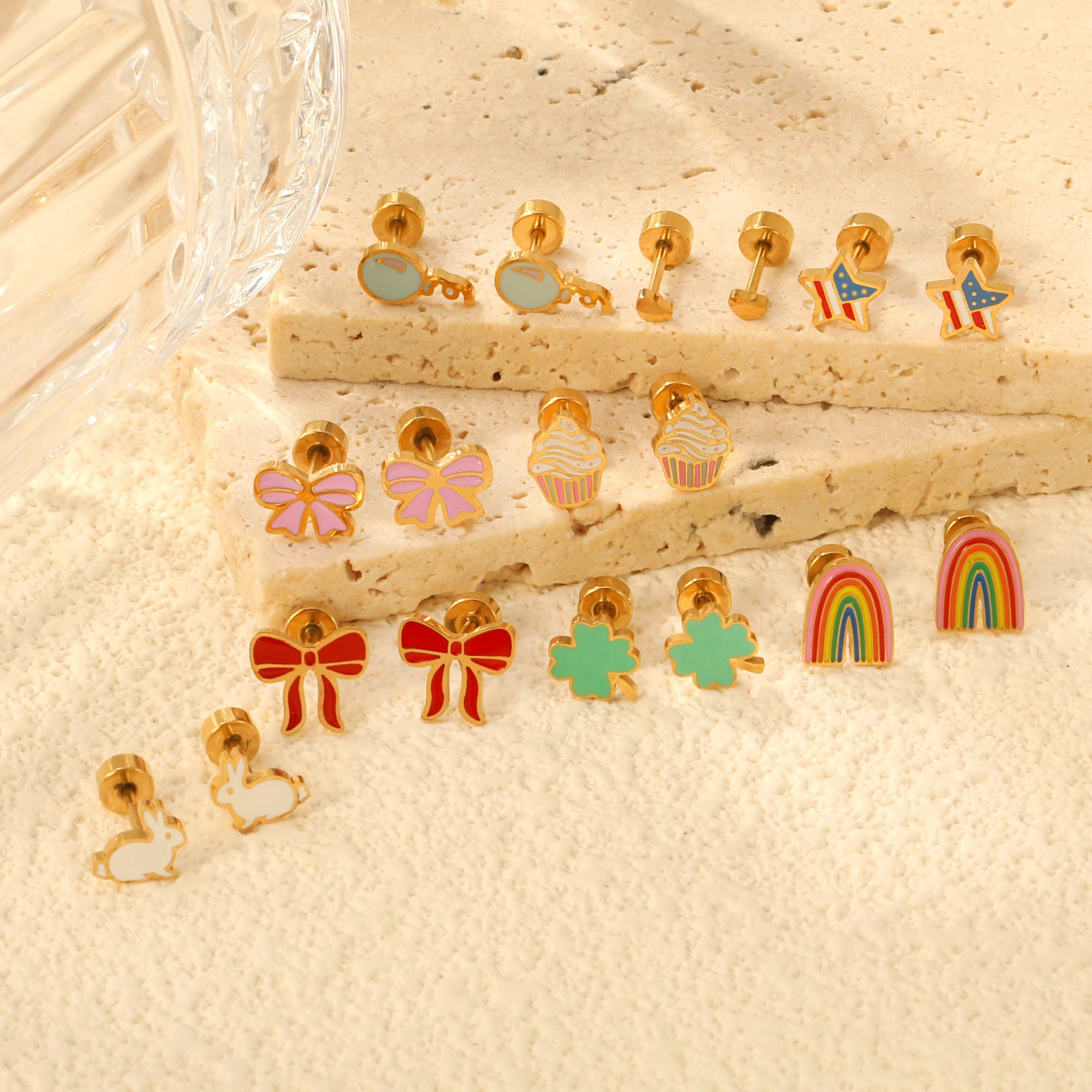 Wholesale Screw Plug Cute Rabbit Bow Rainbow Ice Cream Stainless Steel Girls Earrings