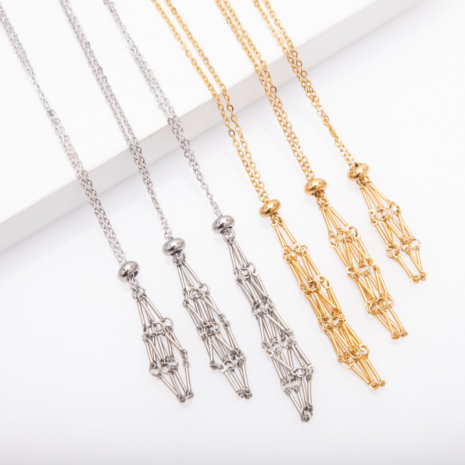 Wholesale Stainless Steel Net Pocket Natural Gemstone Crystal Accessories Bamboo Woven Adjustable Chain Pendant