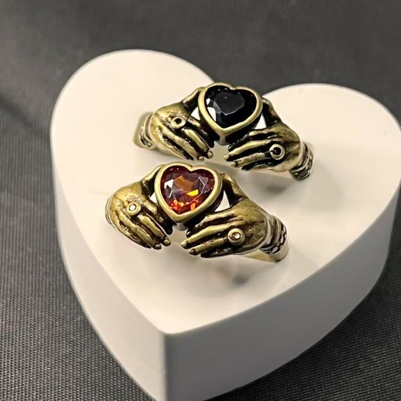 Wholesale Trendy Retro Carving Hands Embrace Red Zircon Couple's Ring Finger Ring Design All-match Valentine's Day