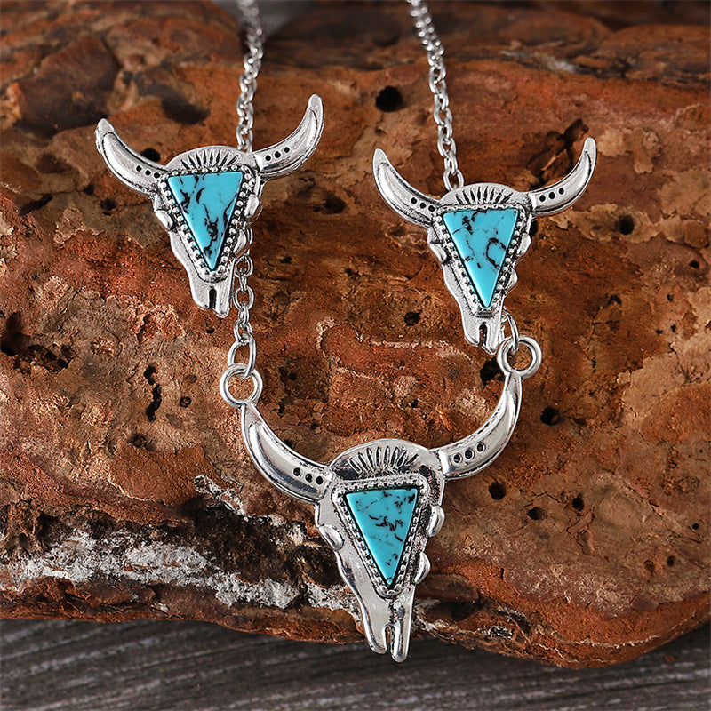 Wholesale Western Cowboy Style Bull Head Triangle Turquoise Earrings Necklace Set Fashion Retro Personality Necklaces