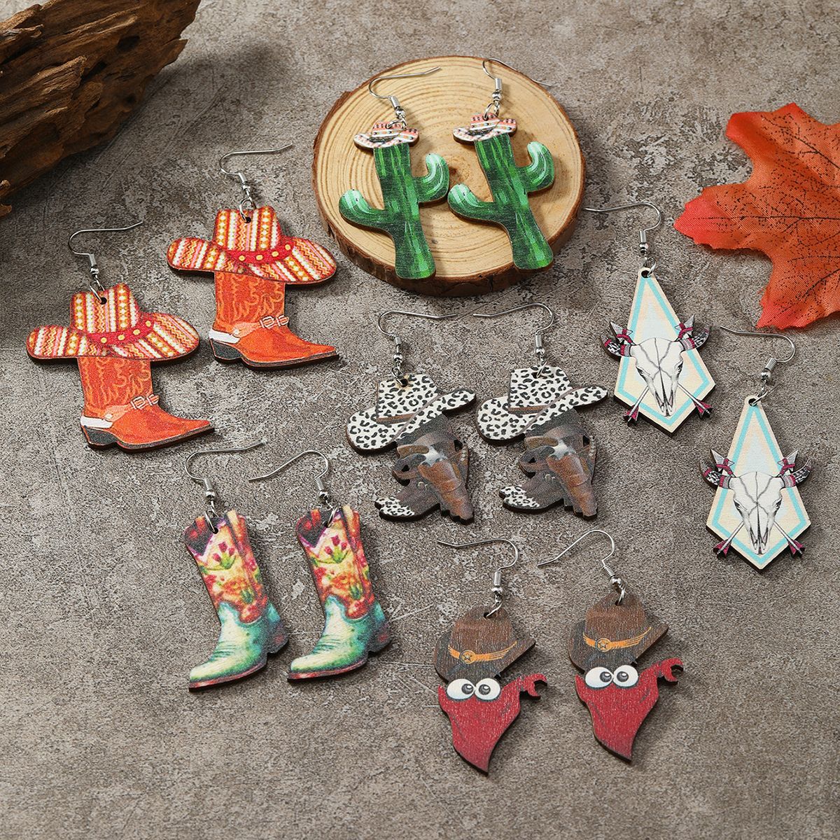 Wholesale Cartoon Sheep Head Cactus Boots Small Flame Cowboy Hat Shoes Wooden Painted Earrings