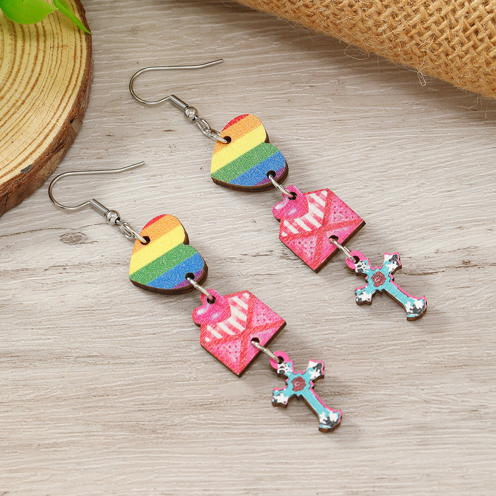Wholesale Valentine's Day Colorful Printed Love Cross Pendant Wooden Earrings