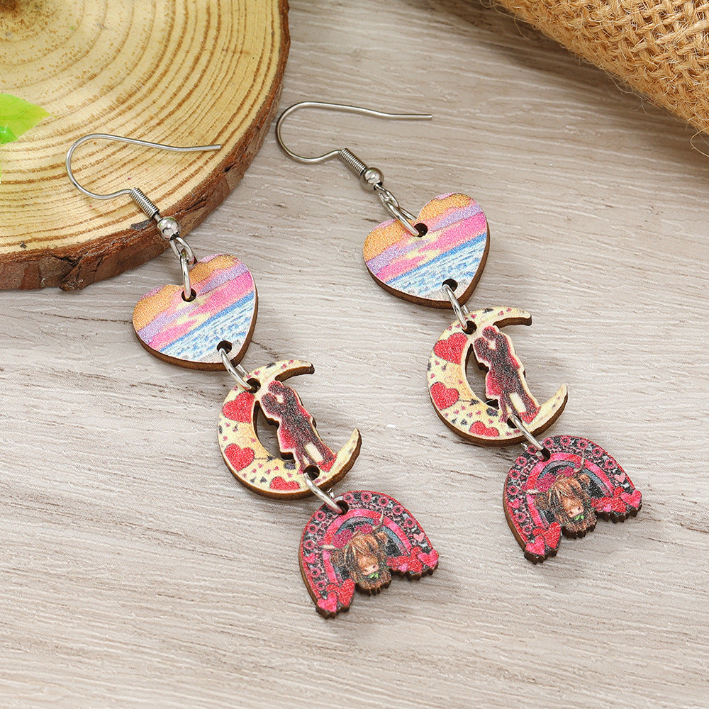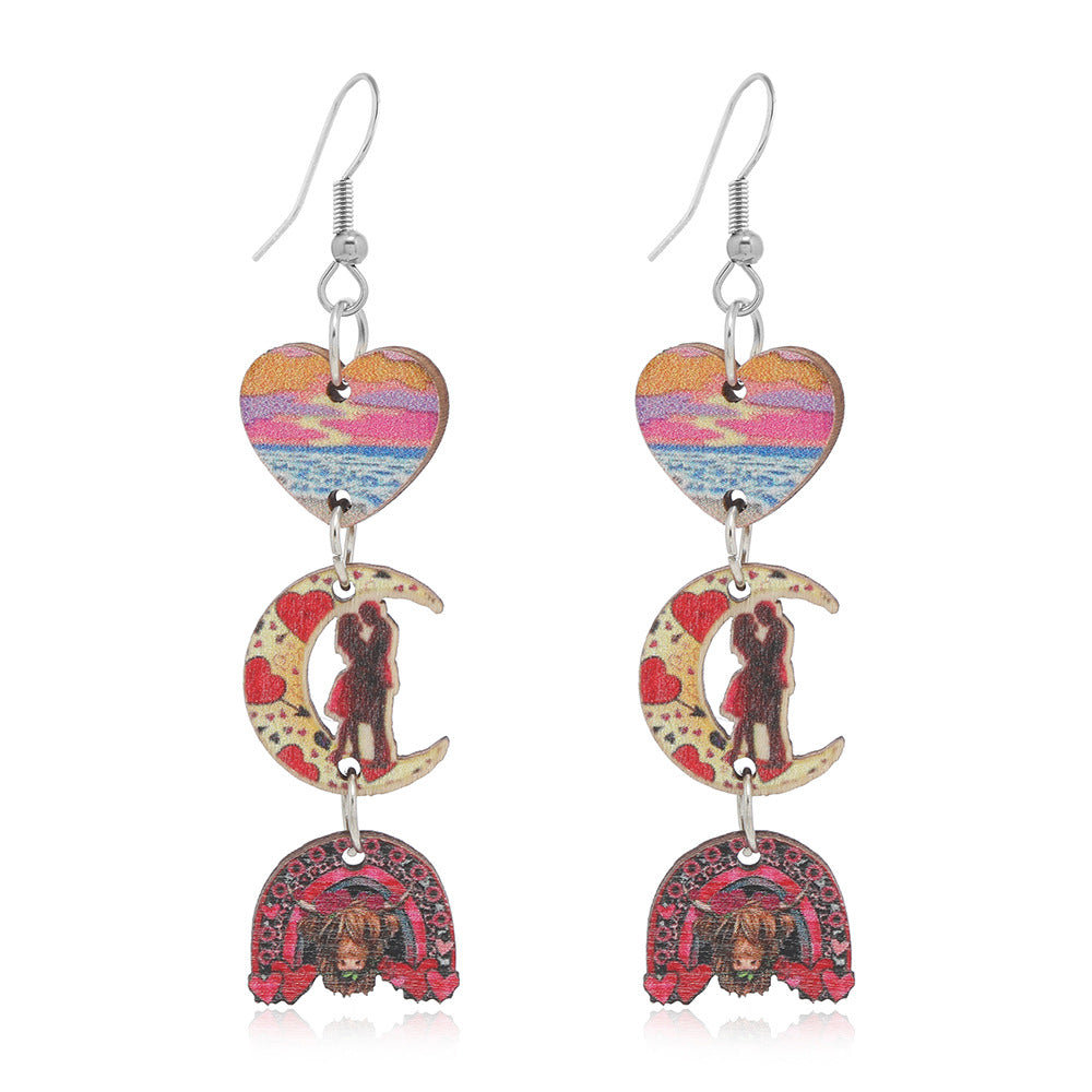 Wholesale Valentine's Day Printed Love Moon Wooden Earrings