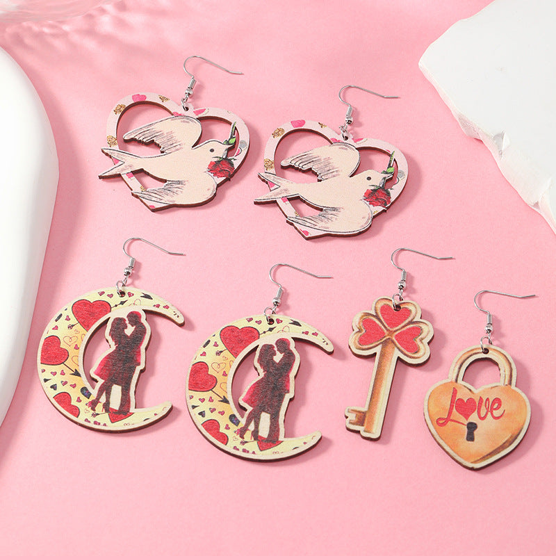Wholesale Valentine's Day Rose Asymmetric Wooden Earrings