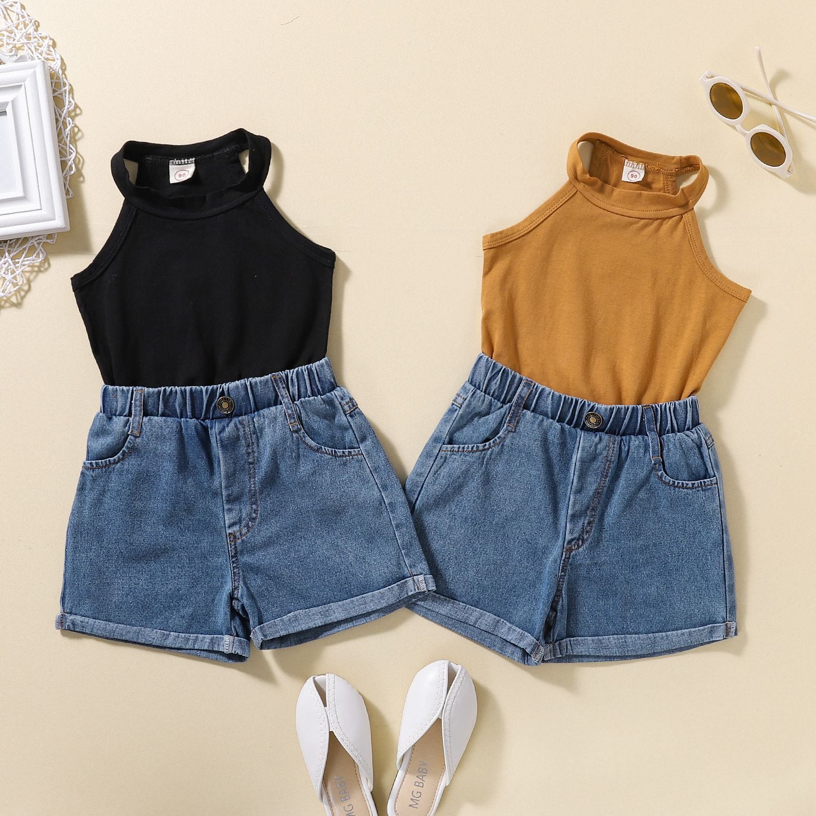 Venta al por mayor Chaleco corto de color sólido + Conjunto de jeans Ropa de bebé de algodón