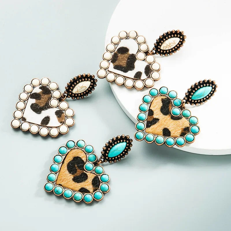 Wholesale Creative leopard print fabric with turquoise heart exaggerated earrings